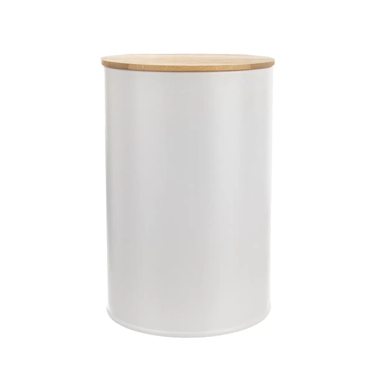 Dóza s viečkom na uloženie cukru, múky, stúhanky, ryže. Materiál: plech, bambus, silikón – tesnenie. Rozmery: o. 1,3 l, pr.11 cm, v. 15,5 cm.