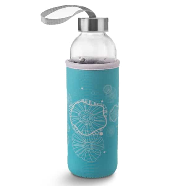 Fľaša z číreho skla, vložená do príjemného neoprénového termoobalu s decentným kvetinovým dekorom, ktorý chráni fľašu pred nárazmi a navyše udržiava nápoj dlhšie v požadovanej teplote, si určite obľúbite.