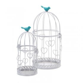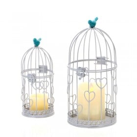 Kovová klietka biela s modrým vtáčikom na vrchu, vhodná ako svietnik alebo lampáš