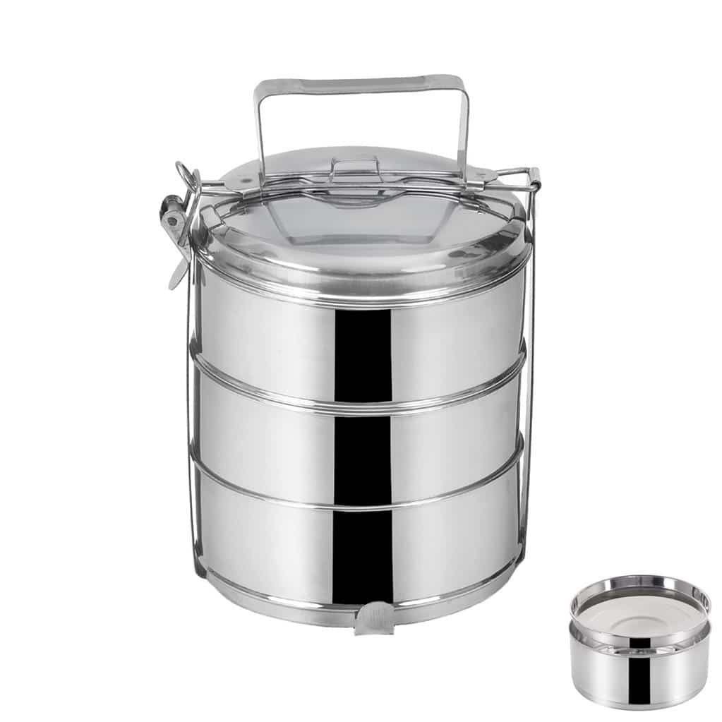 Obedár, 3poschodový.Celonerezový obedár je určený na prenášanie potravín. Súčasťou je kovový stojan, s prackou, ktorá zaistí jeho pevné uzatváranie a prichytenie vrchnej pokrievky. Objem jednotlivých misiek 1300 ml.