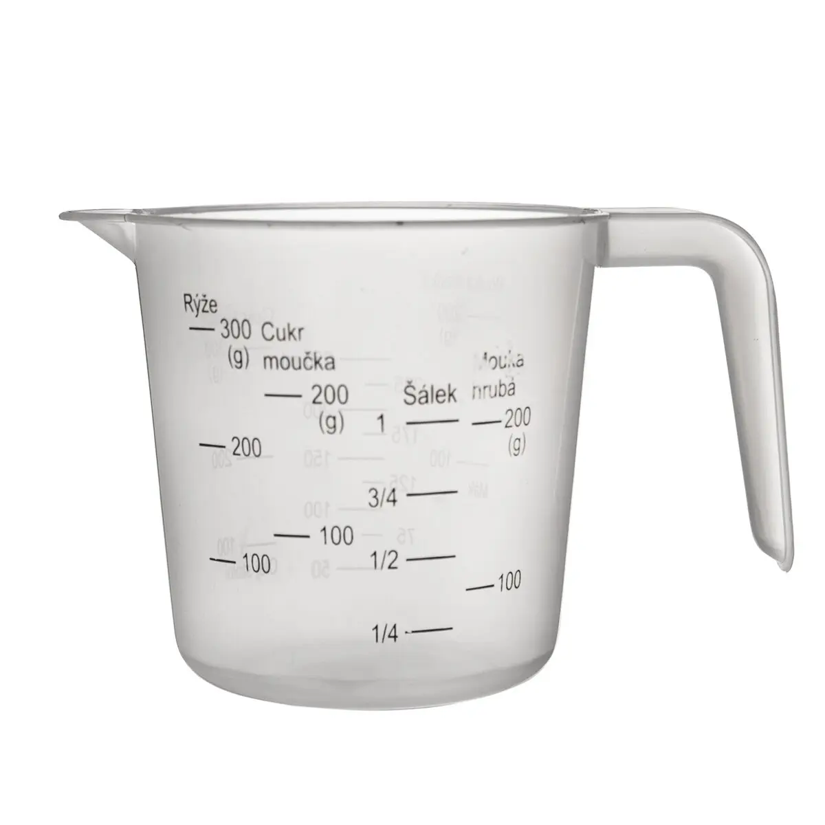 Odmerka s uchom a výlevkou. Odmerka na tekutiny, cukor, múku, olej, mak, ryžu. Materiál: plast. Transparentná. Rozmery: objem – odmerka do 250 ml, pr. 9 cm, v. 9 cm.