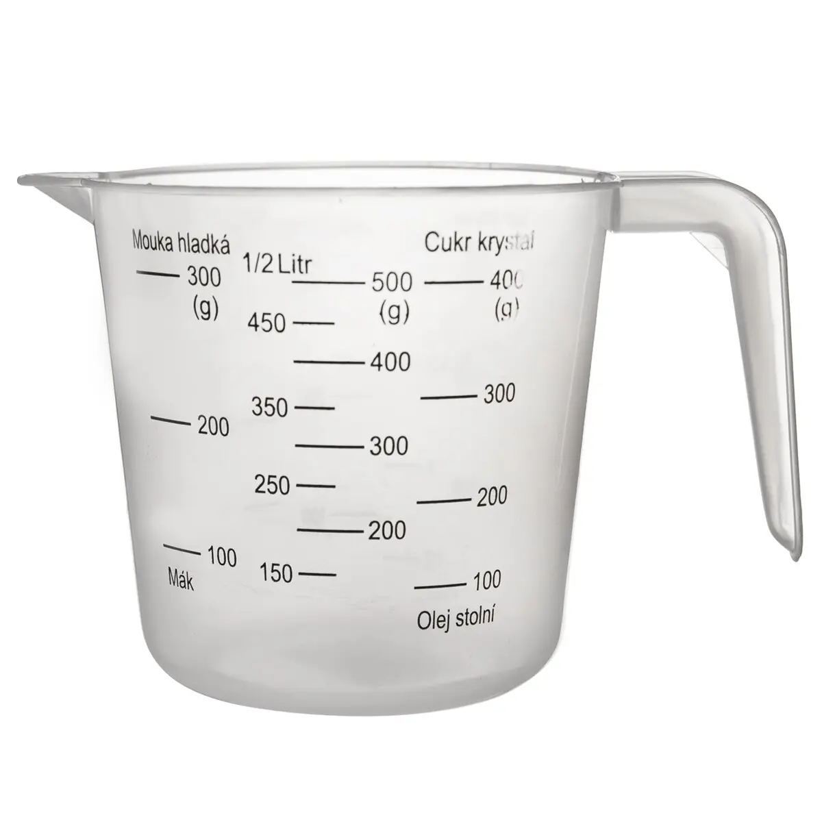 Odmerka s uchom a výlevkou. Odmerka na tekutiny, cukor, múku, olej, mak, ryžu. Materiál: plast. Transparentná. Rozmery: objem – odmerka do 500 ml, pr. 10 cm, v. 10 cm.