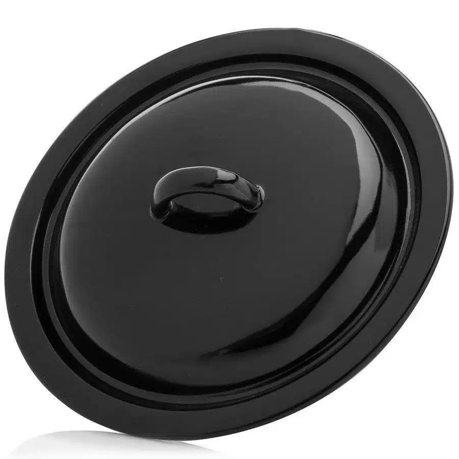 Čierna kuchynská pokrievka je vybavená pohodlnou rukoväťou zo smaltovanej ocele. Je pripevnená zváraním, vďaka čomu je stabilná a neuvoľňuje sa vplyvom tepla, čo zaručuje plnú bezpečnosť a odolnosť.