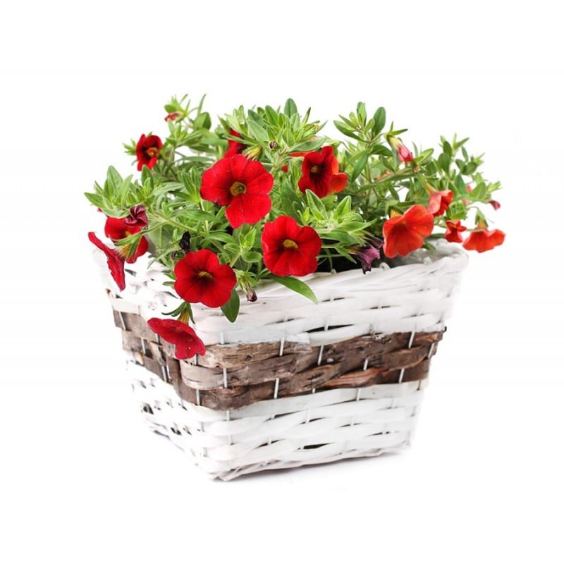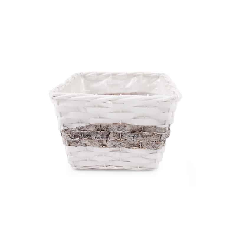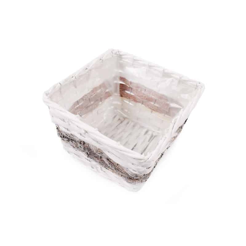 Štvorcový košík na kvety z prútia vystlaný plastovou fóliou a vzorom STROMČEK.
