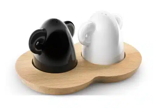 Súprava solničky a koreničky na drevennom stojane. Materiál: porcelán, bambusové drevo.