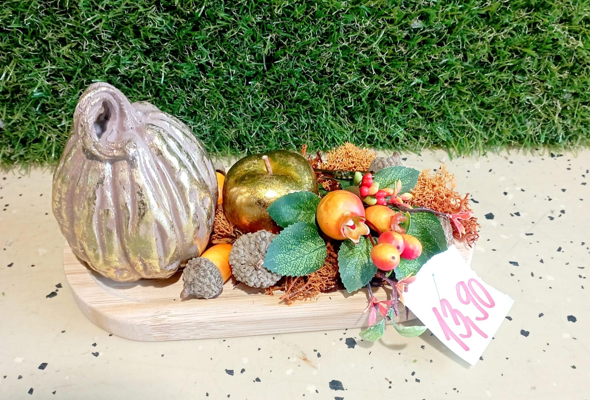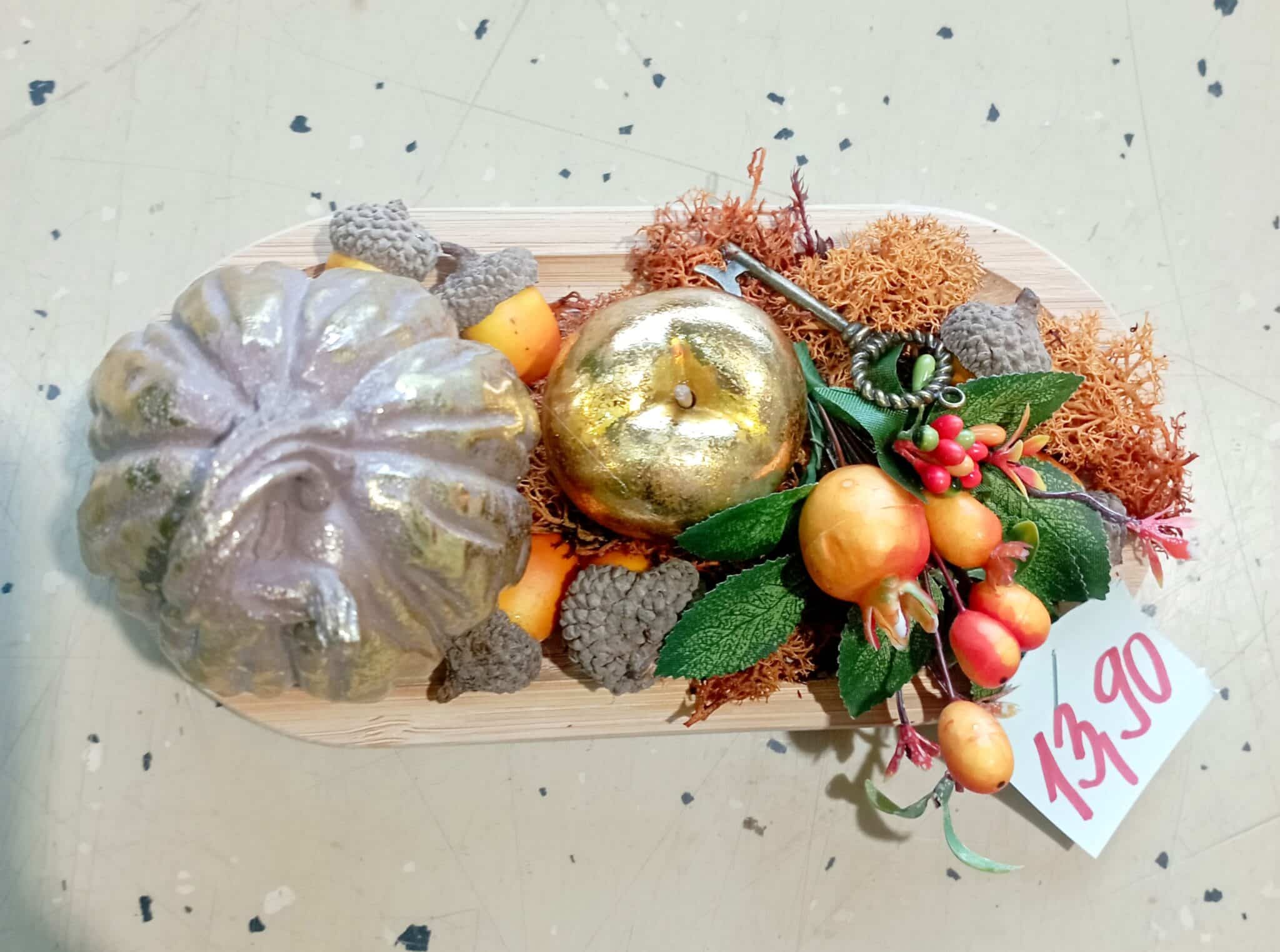 obsahuje: drevenú podložku, zlatú tekvicu a jablko, drobné plody, kovový kľúčik