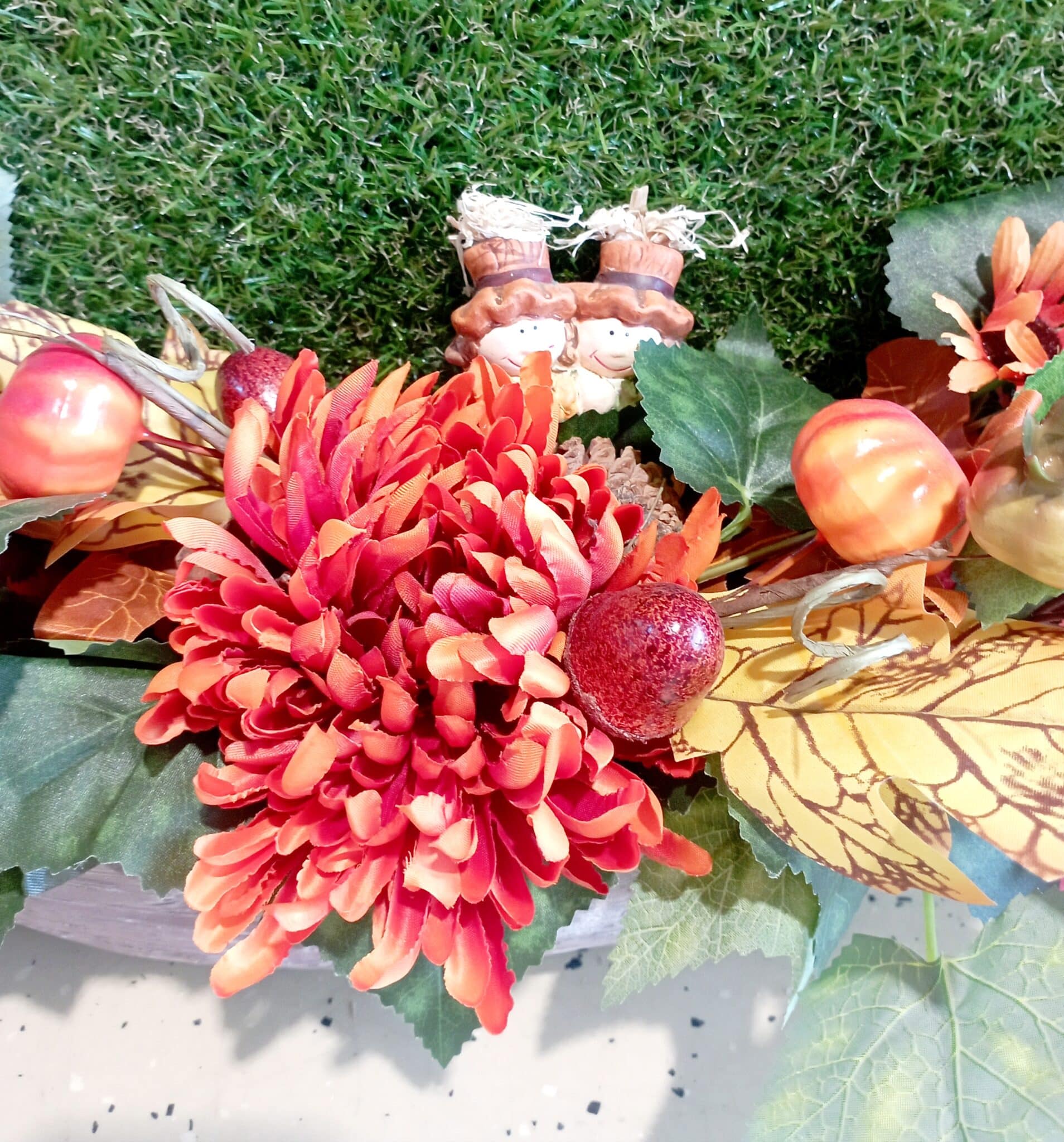 Stolová jesenná dekorácia v kvetináči s figúrkami