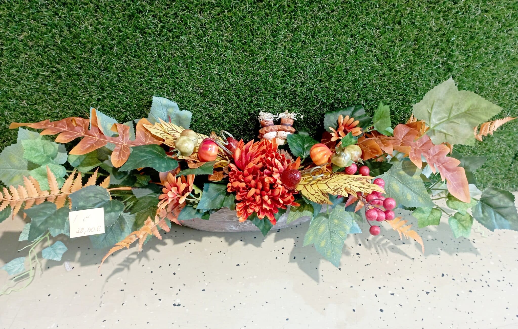 obsahuje: keramický kvetináč, jesenné kvety, listy, plody, tekvice, keramickú figúrku chlapec a dievča