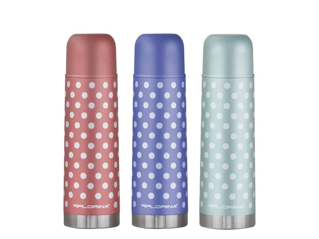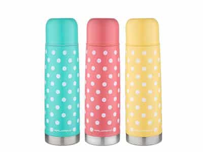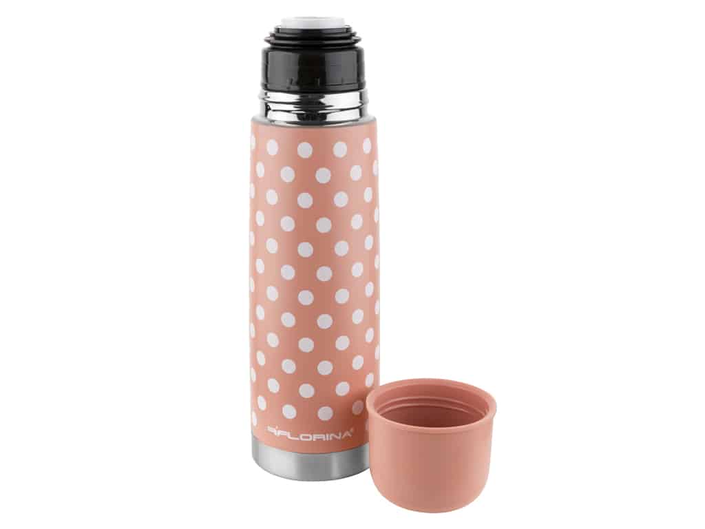 termoska, šrobovateľný uzáver, možnosť naliať stlačením gombíka na uzávere
