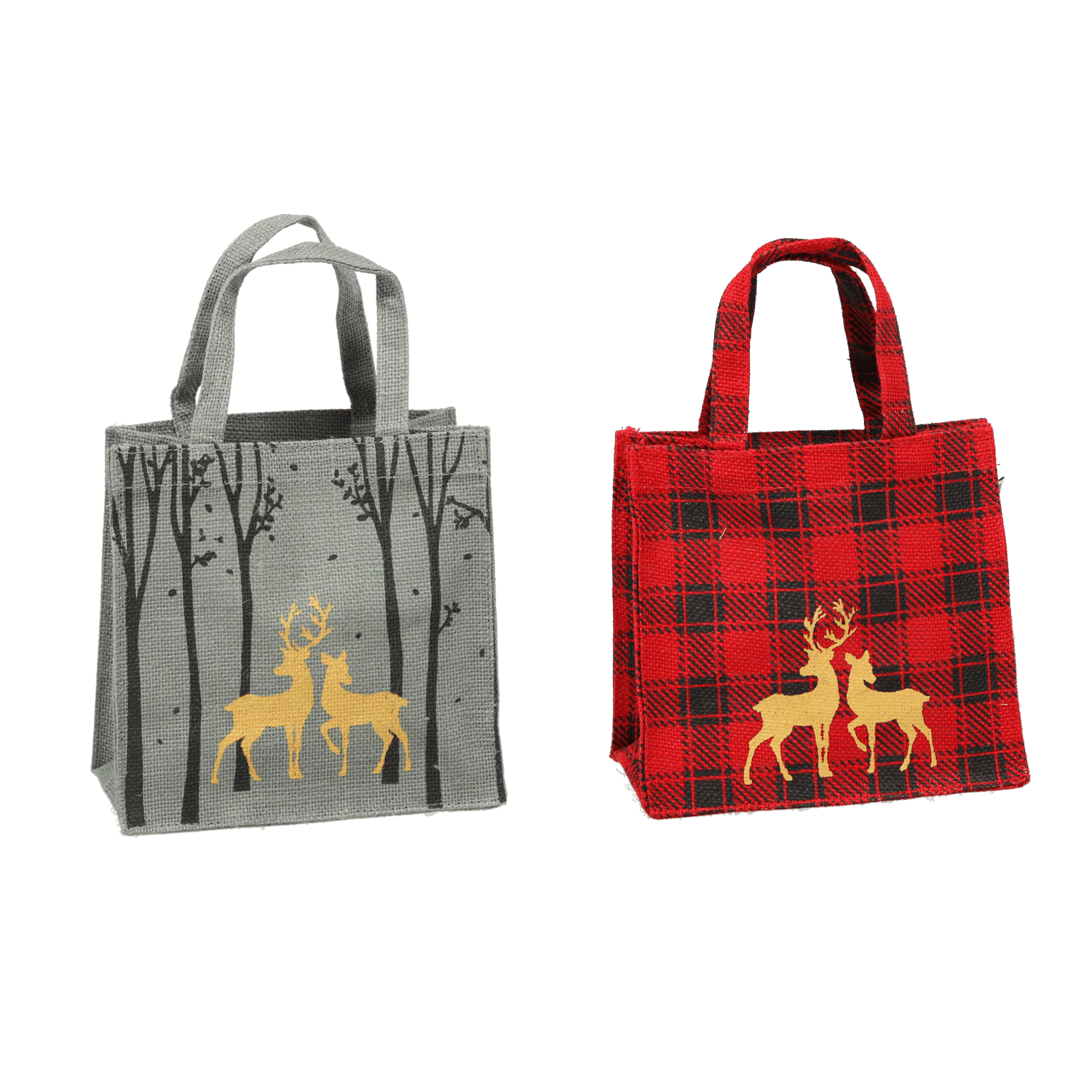 Vianočná jutová taška 20 x 20 cm so zlatým potlačom soba. Praktická a ekologická, ideálna na malé nákupy alebo na obedy. Sivá a červená farba.